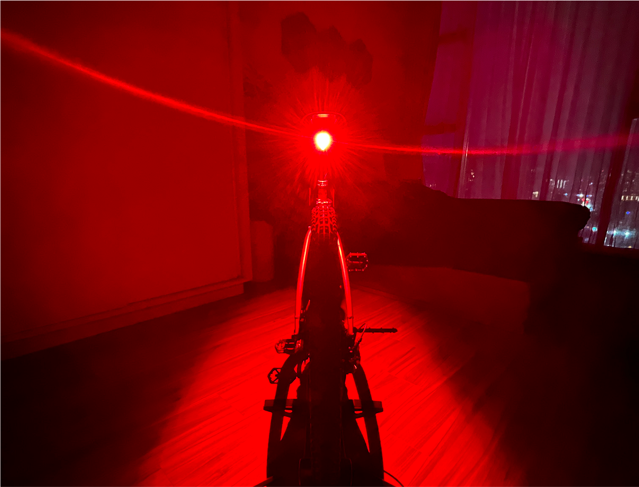 Here's what makes this light special – it's actually two lights working together. Most rear lights only project backward, but the SEEMEE 200 v3.0 creates visibility in two directions. The primary beam delivers 200 lumens of backward visibility for approaching traffic, while a secondary light projects downward, creating a 360° red arc on the road surface around your bike.
